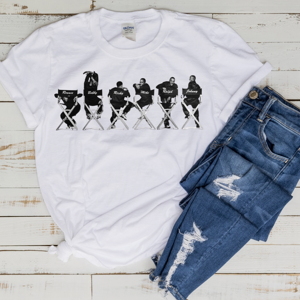 Bring classic vibes to your wardrobe with this stylish graphic tee featuring all 6 New Edition group members sitting in iconic director’s chairs.