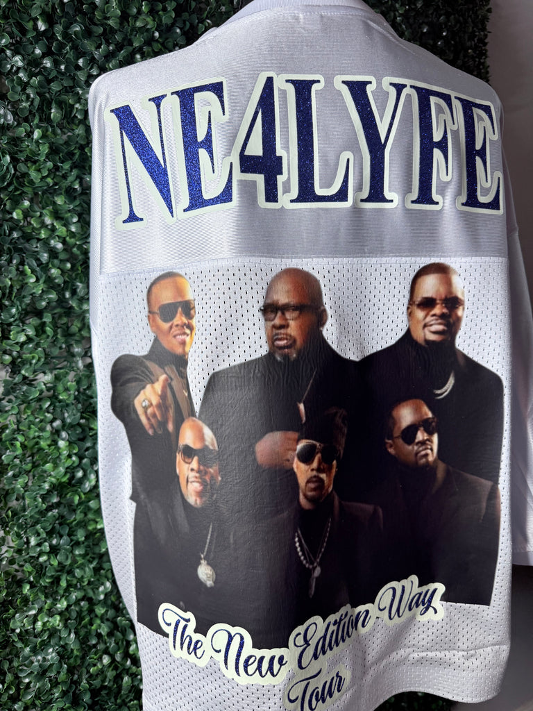 This is a premade design and will look exactly like the pictures, which means that it includes the glow in the dark behind the glitter, please put your glitter text choice in the notes box here. Things can only be taken off of the jersey or switched out, nothing more will be added. For example, if you want your name on the back instead of NE4LYFE that's possible for no additional cost OR if you would like to take the songs off of the front & just leave the guys in the director's chairs along with the text underneath, that is also possible at no additional cost.